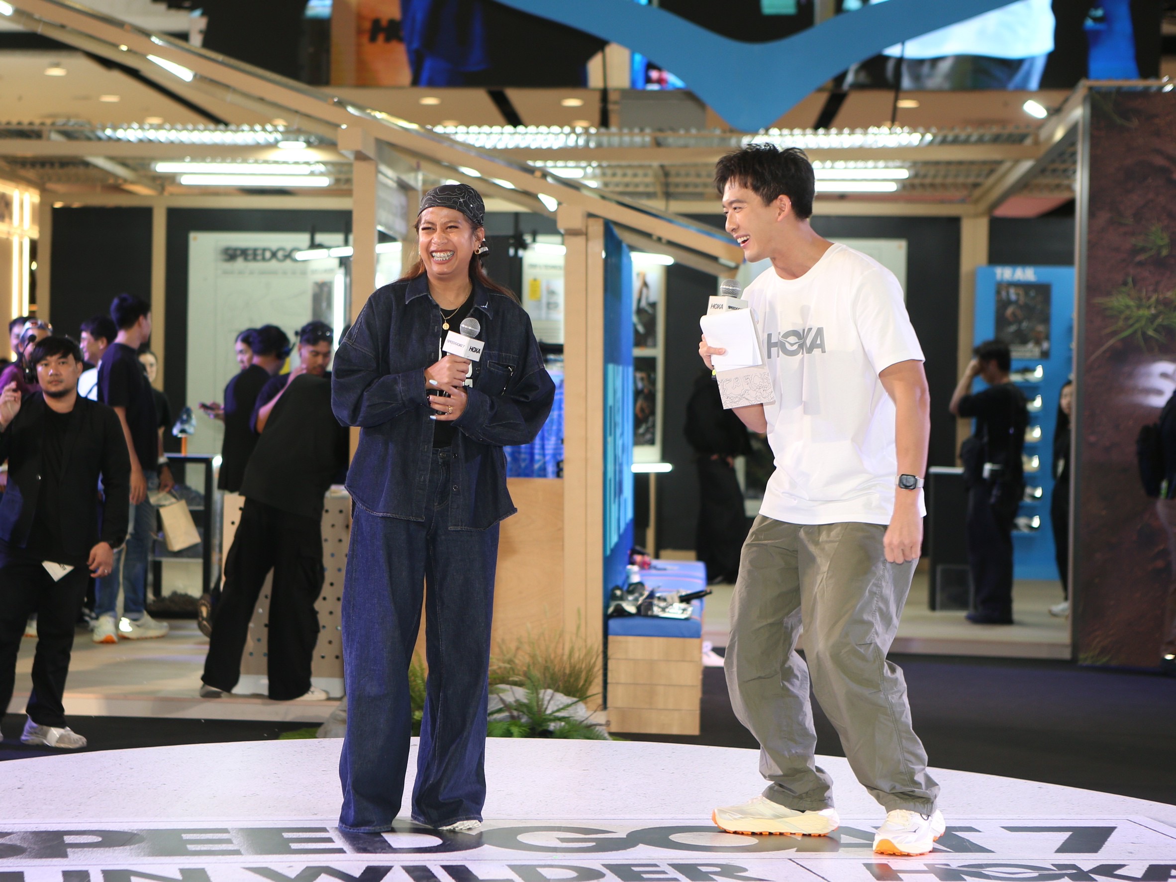 บนเวทีมีการพูดคุยอย่างเป็นกันเองระหว่าง นาย ณภัทร และ “คุณภูมิ” นักวิ่งเทรลระดับ Top ของไทยที่เป็นแรงบันดาลใจของใครหลายคน เกี่ยวกับการใช้งานรองเท้า HOKA Speedgoat 7 ในมิติต่างๆ ทั้งการยึดเกาะ การซัพพอร์ตขั้นสุดในสนามแข่งจริงจัง และความมั่นใจสูงสุดในทุกสภาพพื้นผิว ทั้งพื้นผิวลื่นและโคลน ไปจนถึงความเบาสบายที่สามารถใส่เดินห้างหรือทำกิจกรรมในเมืองได้อย่างคล่องตัว ตอกย้ำความเป็นรองเท้าแบบ Performance Lifestyle ที่ตอบโจทย์คนรุ่นใหม่ได้อย่างแท้จริง รวมไปถึงประสบการณ์การวิ่งเทรลให้กับคอมมูนิตี้นักวิ่งที่มาร่วมงานได้เก็บเกี่ยวเทคนิคเพื่อนำไปใช้ต่อให้การวิ่งจริง