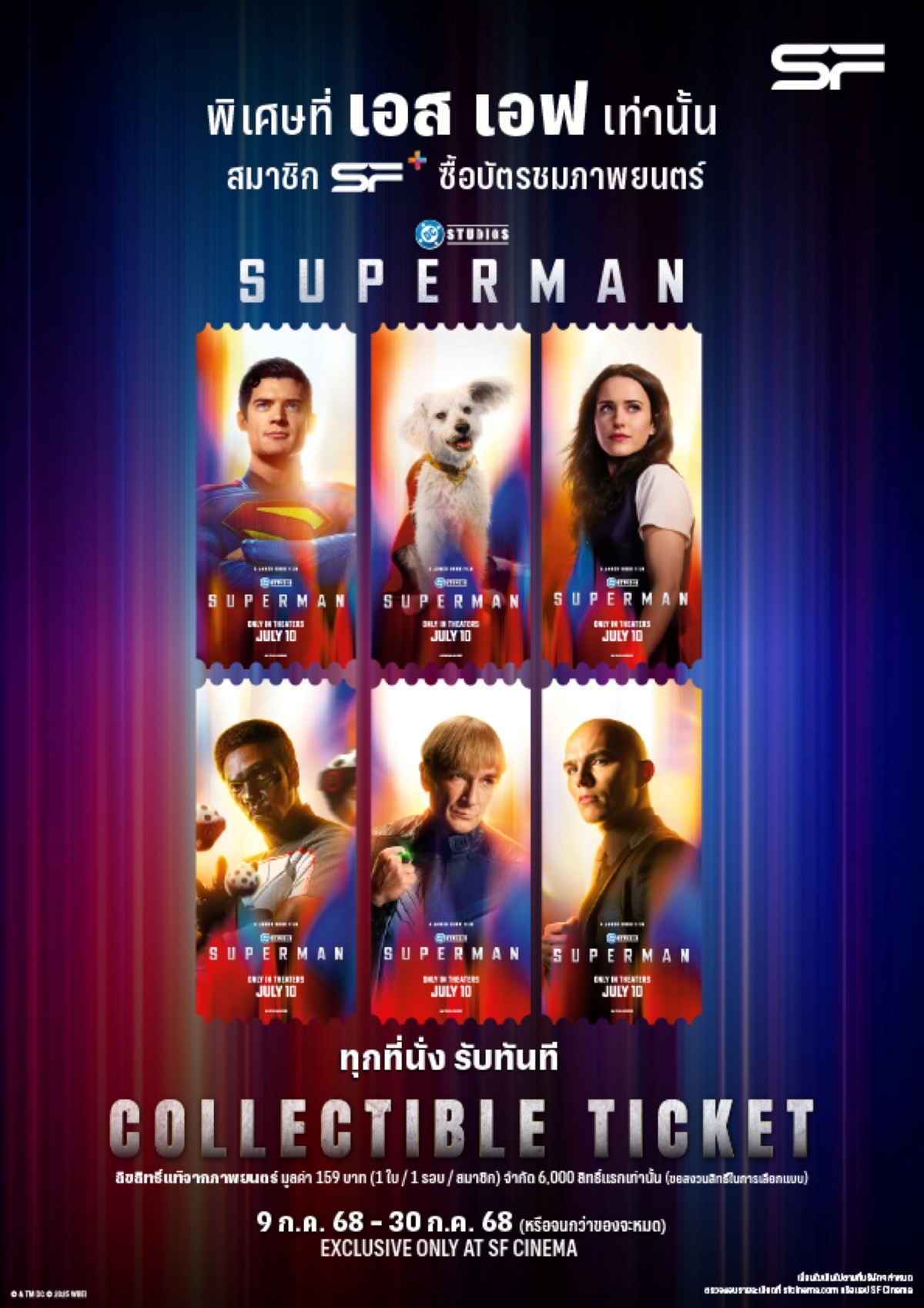 · สมาชิก SF+ ที่ซื้อบัตรชมภาพยนตร์ “Superman(ซูเปอร์แมน)” ทุกที่นั่งรับทันที SF+ Collectible Ticket ลิขสิทธิ์แท้จากภาพยนตร์ ( 1 ใบ / 1 รอบ / 1 สมาชิก ) มี 6 แบบให้สะสม ตั้งแต่วันที่ 9 กรกฎาคม 2568 เป็นต้นไปจนตลอดโปรแกรมฉาย หรือจนกว่าของจะหมด