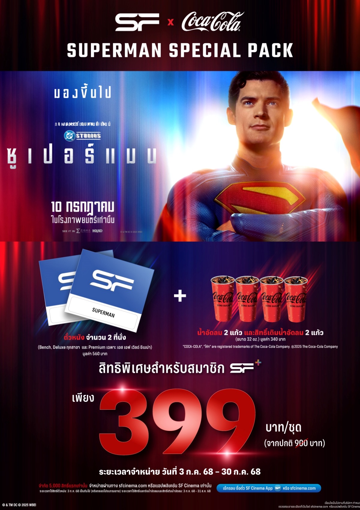 โรงภาพยนตร์ในเครือ เอส เอฟ ต้อนรับการกลับมาอีกครั้งของตำนานซูเปอร์ฮีโร่ “Superman(ซูเปอร์แมน)” กับจุดเริ่มต้นครั้งใหม่จาก ดีซี สตูดิโอ โดย “เจมส์ กันน์” ที่เป็นผู้กำกับให้กับเรื่องราวของซูเปอร์ฮีโร่ต้นฉบับในจักรวาล DC สุดคุ้มกับแพ็กเกจ “SF X COKE – Superman Special Pack” ราคาพิเศษชุดละ 399 บาท ภายในแพ็กประกอบด้วย สิทธิ์บัตรชมภาพยนตร์ “Superman(ซูเปอร์แมน)” จำนวน 2 ที่นั่ง (เฉพาะที่นั่ง Deluxe, Bench ทุกสาขา และ ที่นั่ง Premium เฉพาะสาขา เอส เอฟ เวิลด์ ซีเนม่า), สิทธิ์แลกน้ำอัดลม ขนาด 32 OZ. จำนวน 2 แก้ว และ สิทธิ์เติมน้ำอัดลม ขนาด 32 OZ. จำนวน 2 แก้ว จำหน่ายที่โรงภาพยนตร์ในเครือ เอส เอฟ ทุกสาขาทั่วประเทศ ตั้งแต่วันนี้เป็นต้นไป จนตลอดโปรแกรมฉายหรือจนกว่าสินค้าจะหมด