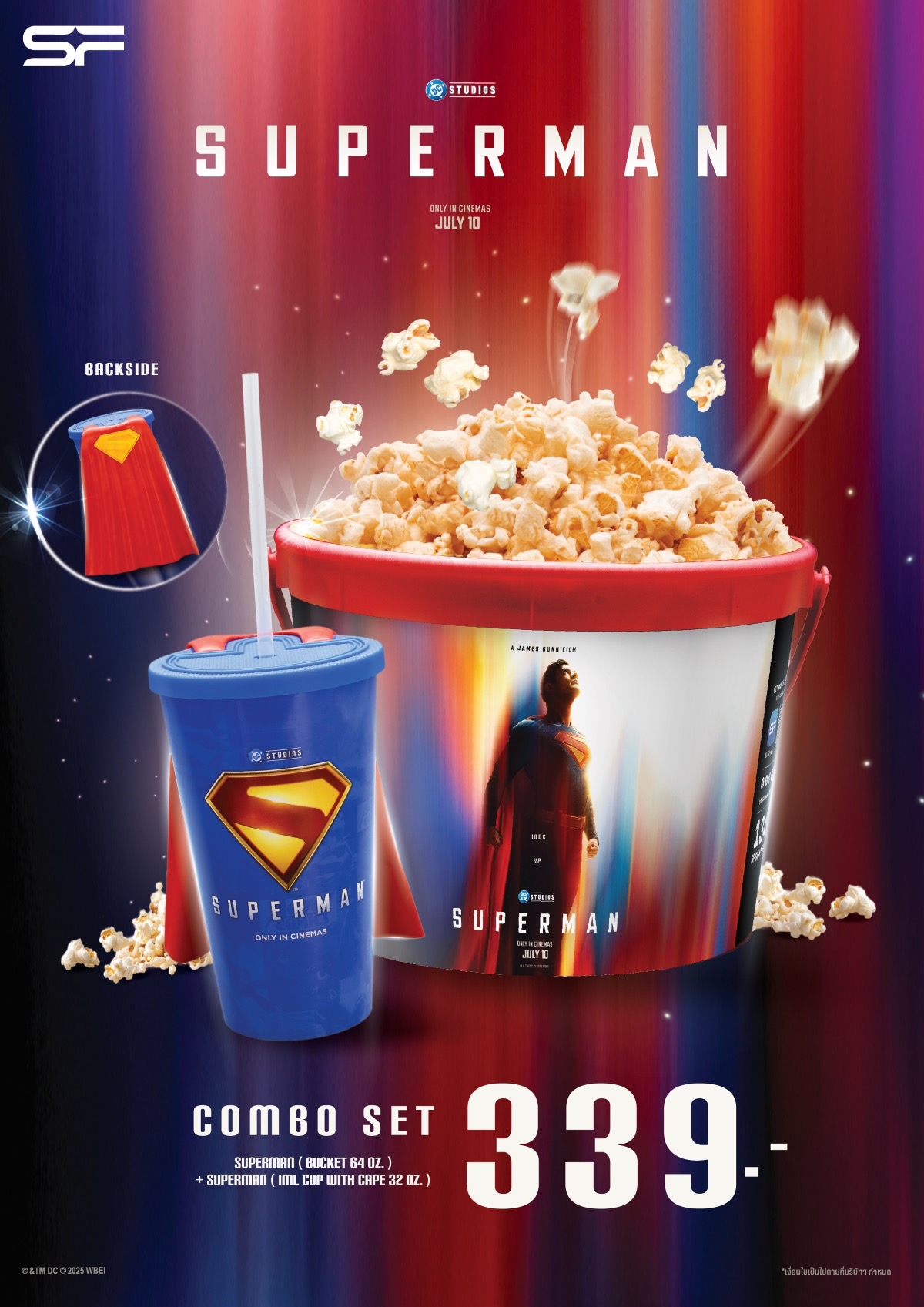· ห้ามพลาดกับ “Superman Combo Set” คอมโบเซทสุดเอ็กซ์คลูซีฟลิขสิทธิ์แท้จากภาพยนตร์ ในราคาเพียง 339 บาท ภายในเซทประกอบด้วย Superman Popcorn Bucket ถังป๊อปคอร์ลายภาพยนตร์พร้อมป๊อปคอร์นขนาด ขนาด 64 ออนซ์ (สามารถเลือกรสชาติป๊อปคอร์นได้) และ Superman IML Cup With Cape แก้วน้ำลายภาพยนตร์พร้อมเคปผ้าคลุม Superman พร้อมน้ำอัดลมขนาด 32 ออนซ์ 1 แก้ว วางจำหน่ายตั้งแต่วันนี้เป็นต้นไปจนกว่าสินค้าจะหมด ที่โรงภาพยนตร์ในเครือ เอส เอฟ สาขาที่ร่วมรายการ