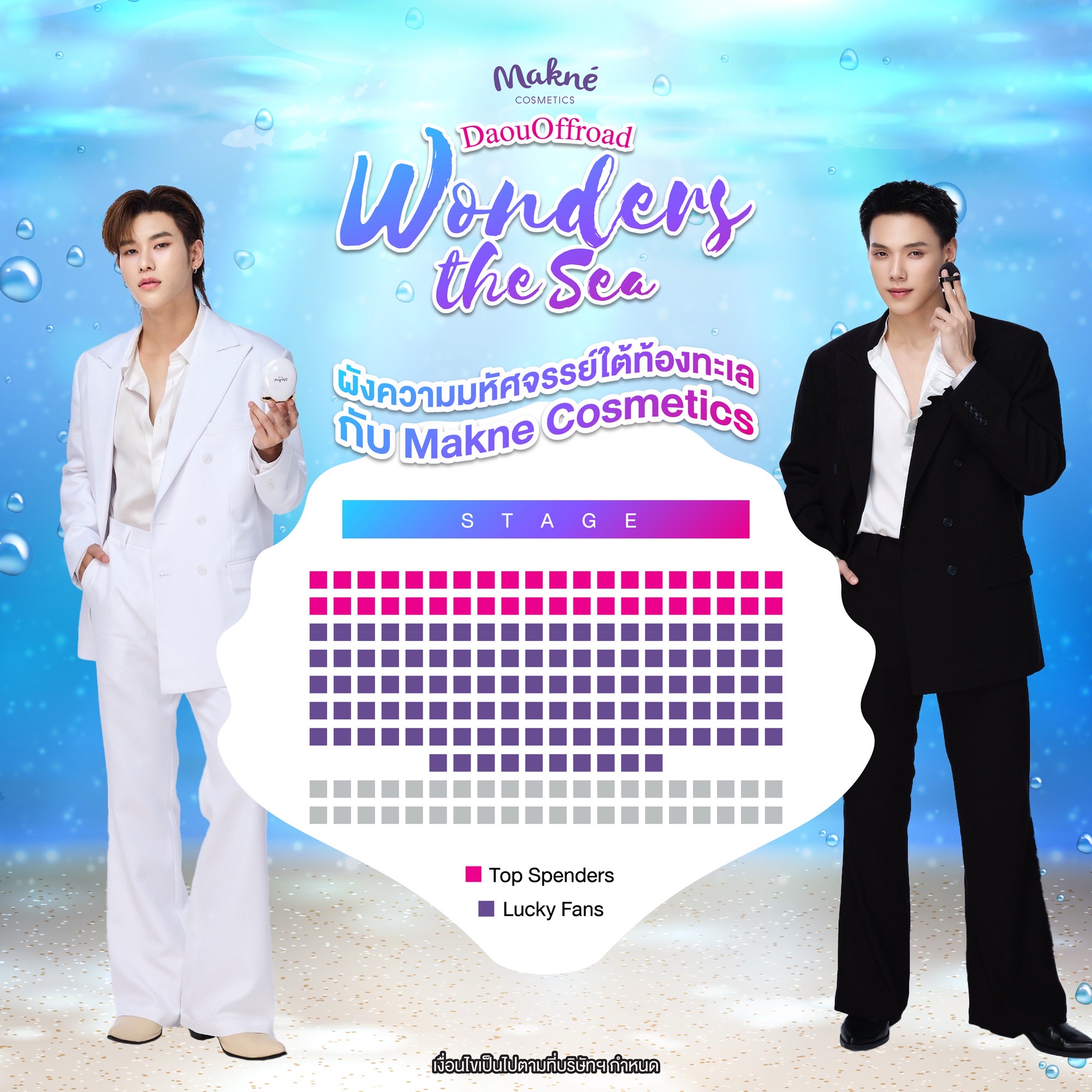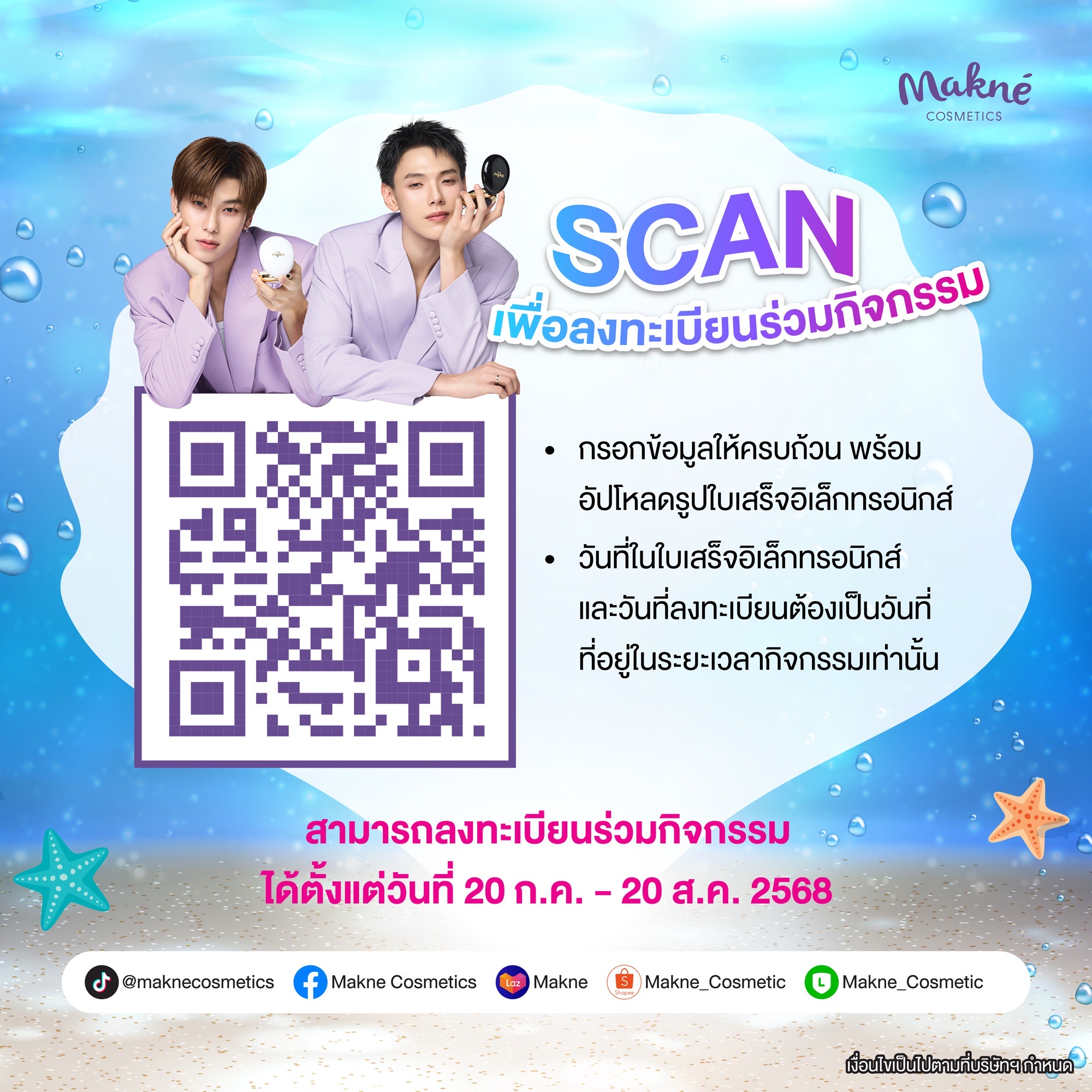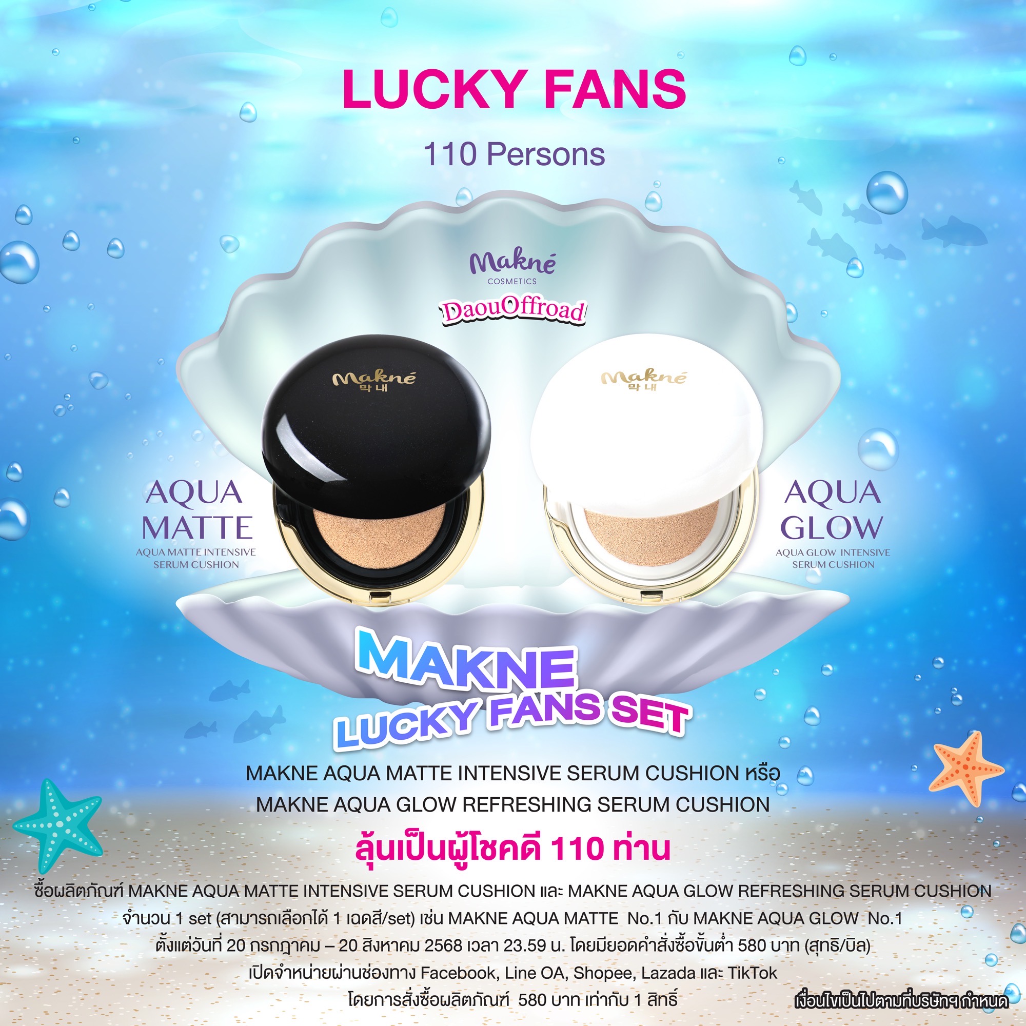 - LUCKY FAN ผู้โชคดีลำดับที่ 1-110: ซื้อผลิตภัณฑ์ MAKNE AQUA MATTE INTENSIVE SERUM CUSHION และ MAKNE AQUA GLOW REFRESHING SERUM CUSHION จำนวน 1 set