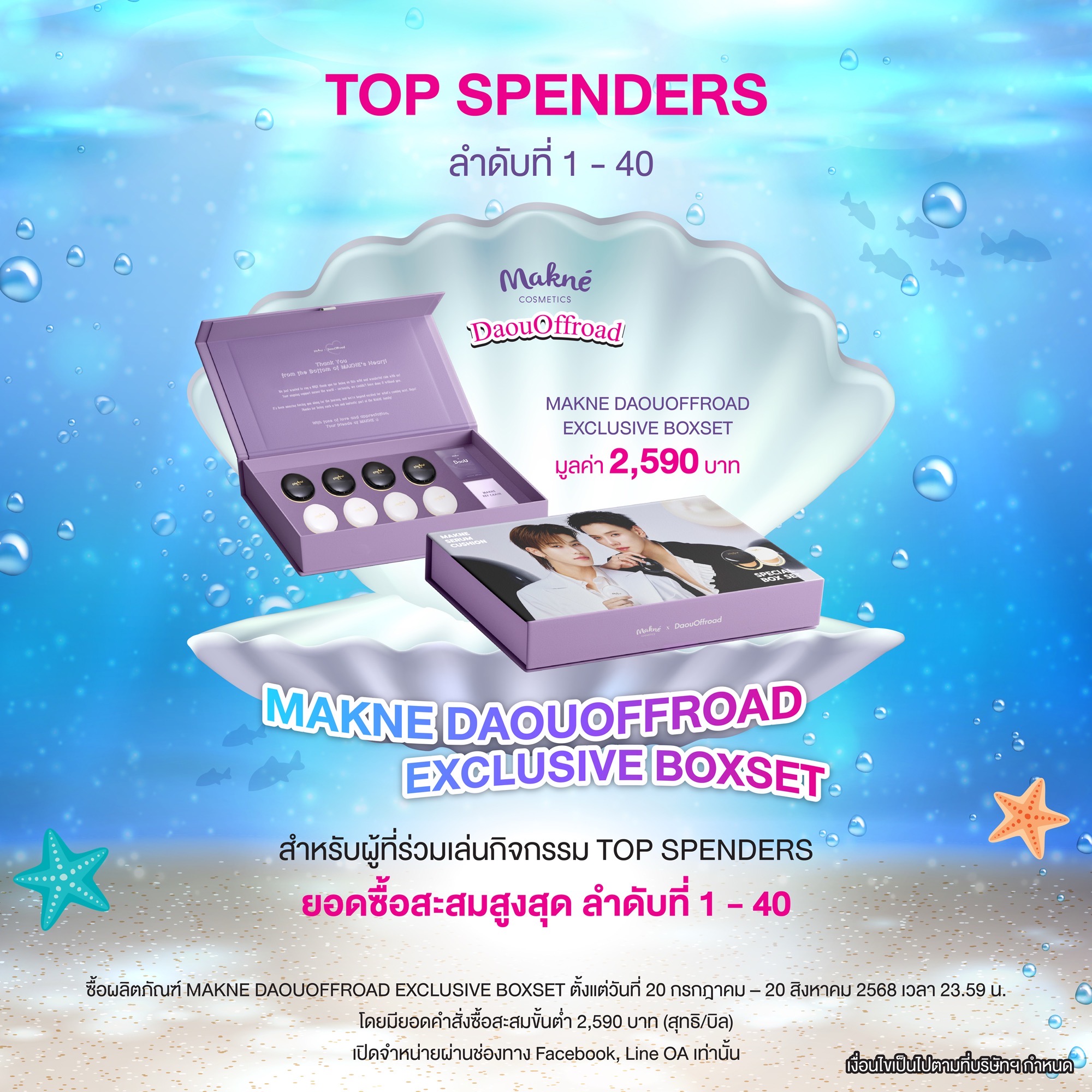 - TOP SPENDERS ผู้ที่มียอดซื้อสะสมสูงสุด 1-40: ซื้อผลิตภัณฑ์ “MAKNE DAOUOFFROAD EXCLUSIVE BOXSET” โดยมียอดคำสั่งซื้อขั้นต่ำ 2,590 บาท (สุทธิ/บิล)