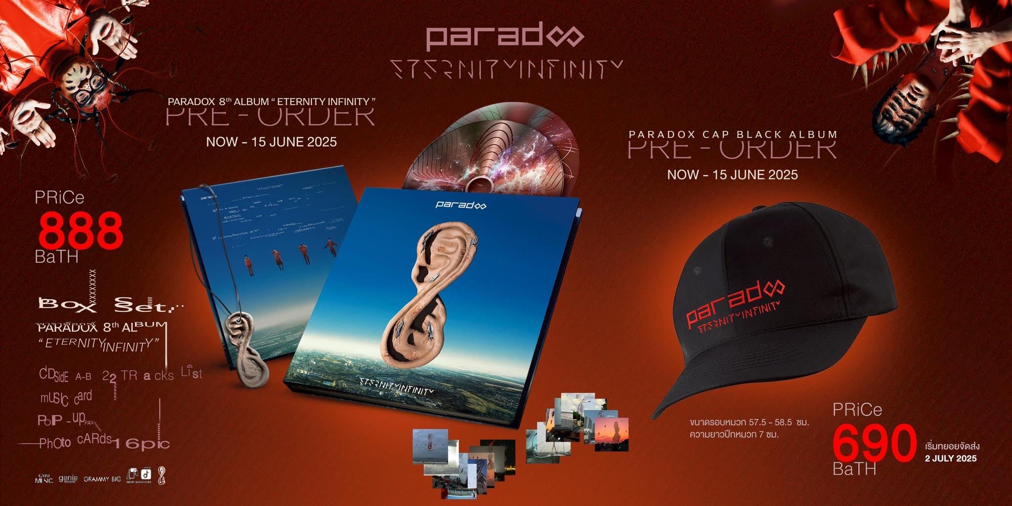 ติดตามฟังอัลบั้ม “ETERNITY / INFINITY” ของวง PARADOX ได้ทาง Youtube Genierock : https://youtube.com/playlist?list=PLbhUhWUJqdUitHPi2hyPmYgkf-x5wpEDN&si=RO4iBf0dhFYhNn6x และทุกช่องทางทาง Music Streaming สำหรับใครที่สนใจ PARADOX ETERNITY INFINITY BOX SET PARADOX 8th ALBUM ราคา 888.- สามารถ PRE-ORDER ได้ตั้งแต่วันนี้ – 15 มิ.ย. 68 ที่ GMM MUSIC Store