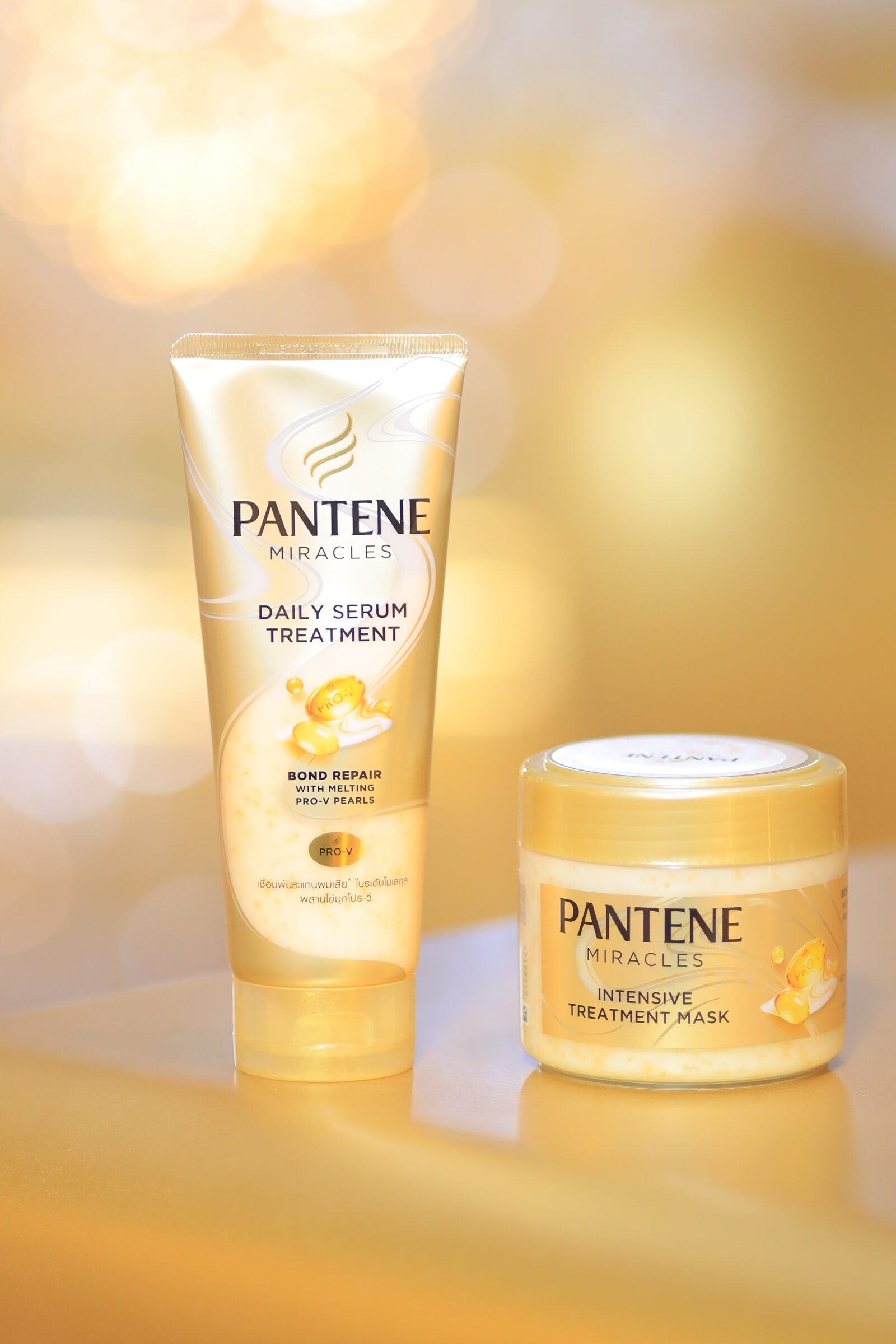 เริ่มจาก PANTENE MIRACLES DAILY SERUM TREATMENT ทรืทเม้นท์เนื้อสัมผัสเบาสบายที่มาในรูปแบบหลอด คิดค้นมาเพื่อตอบโจทย์ผู้ที่อยากบำรุงผมทุกวัน บีบใช้ง่าย สะดวก รวดเร็ว ล้างออกง่าย โดยไม่ทำให้ผมหนัก ลีบแบน และเหนียวเหนอะหนะ หยิบใช้ได้ทุกวัน แม้ในการสระผมตอนเช้า หรือ ในวันที่คุณเร่งรีบมีเวลาไม่กี่นาทีในห้องน้ำ เหมาะสำหรับผมแห้งเสียจากการทำสีผมและความร้อนที่ต้องการดูแลอย่างต่อเนื่อง ถัดมากับ PANTENE MIRACLES INTENSIVE TREATMENT MASK ทรีทเม้นท์สูตรเข้มข้นที่มาในรูปแบบกระปุก สำหรับ “กู้วิกฤตเส้นผม” อย่างแท้จริง เหมาะกับคนที่ผ่านการทำร้ายผมด้วยเคมีแบบจัดเต็ม เช่น ดัด ยืด กัดสี หรือเผชิญความร้อนสะสมและใช้ความร้อนเป็นประจำ จนรู้สึกว่าผมไม่มีทางฟื้นได้อีก จนผมแห้ง เปราะ ขาดง่าย ไม่ตอบสนองกับทรีทเม้นท์ทั่วไป ในหนึ่งกระปุกอัดแน่นด้วยไข่มุกโปร-วิตามินกว่า 10,000 เม็ด ที่จะละลายเมื่อโดนน้ำ และฟื้นบำรุงลึกถึงแกนผม ใช้เพียงสัปดาห์ละ 2-3 ครั้ง ก็สามารถเปลี่ยนผมเสียเป็นผมสวย เงางาม มีชีวิตชีวาได้อย่างน่าประทับใจ