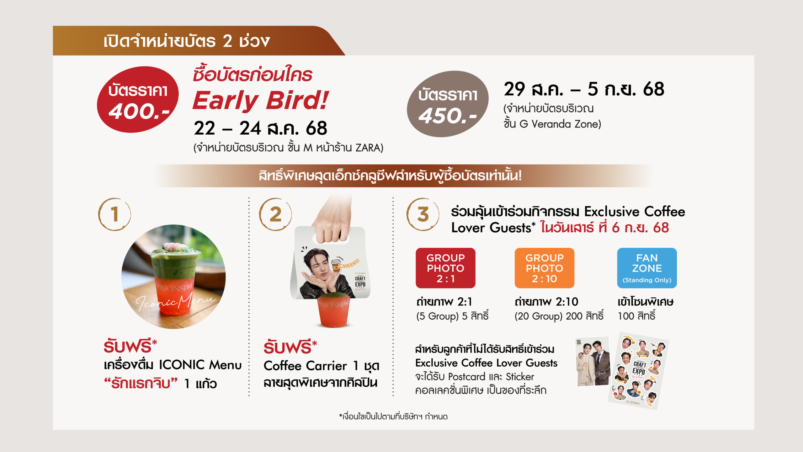เครื่องดื่ม ICONIC Menu “รักแรกจิบ” เปิดจำหน่ายที่นี่ ICONIC CRAFT COFFEE EXPO 2025 วันที่ 29 สิงหาคม – 6 กันยายน 2568 ที่จุดจำหน่ายโซนโซน The Veranda ชั้น G ในราคาแก้วละ 450 บาท ไม่อยากพลาดความฟินซื้อแบบ Early นก!! ก่อนใครได้ในวันที่ 22-24 สิงหาคม 2568 ก่อนหน้าร้าน Zara