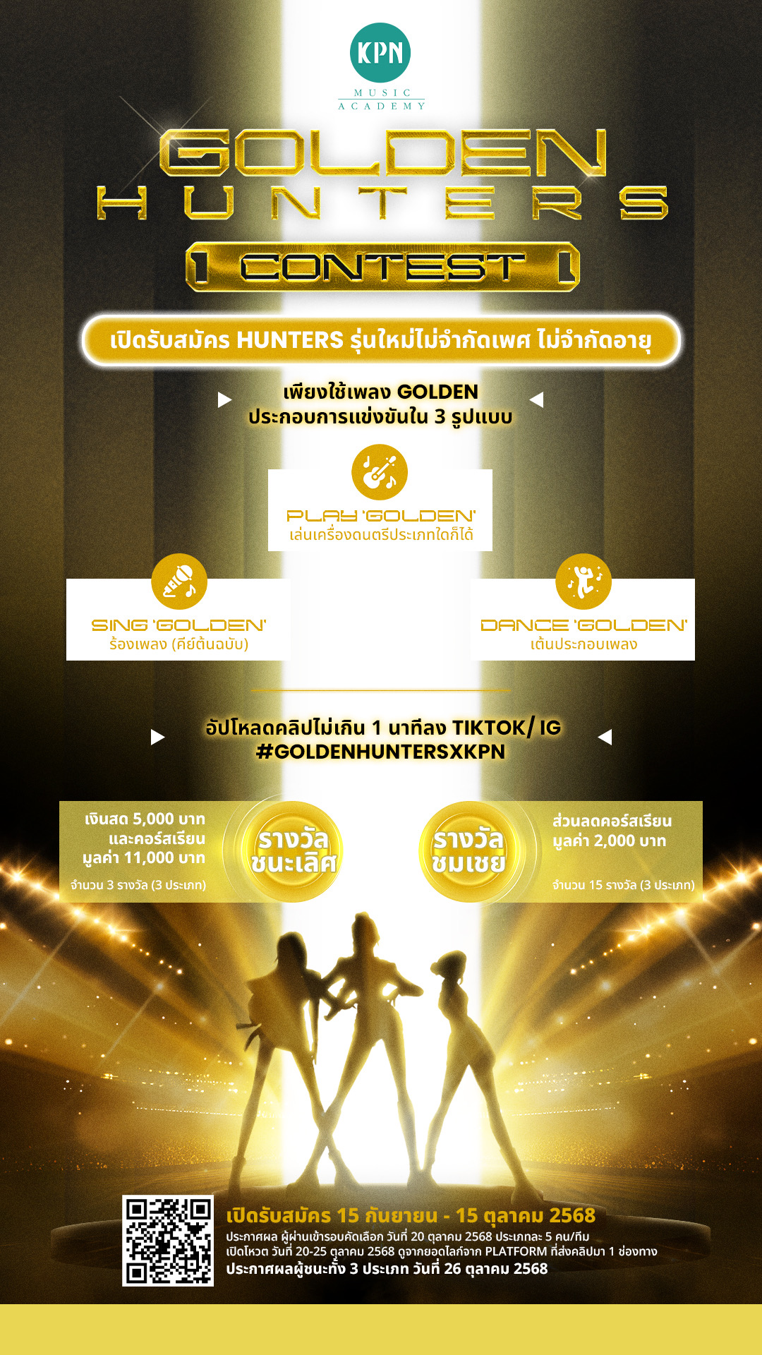 ได้เวลารวมตัว Hunters จากทั่วประเทศ Universal Music Thailand ชวนเหล่านักล่าปิศาจคนเก่ง สร้างฮอนมูนสีทองจากเพลง “Golden” เพื่อค้นหาสุดยอด Golden Hunters คว้ารางวัลใหญ่จาก KPN Music Academy ไปครองกันแบบง่าย ๆ ในกิจกรรม KPN Golden Hunters