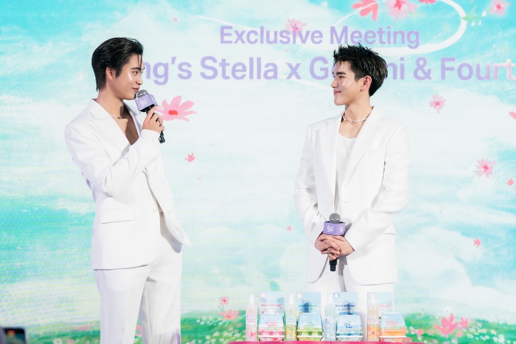 เจมีไนน์-นรวิชญ์ ฐิติเจริญรักษ์ และ โฟร์ท-ณัฐวรรธน์ จิโรชน์ธิกุล กล่าวถึงความรู้สึกในการร่วมงานครั้งนี้ว่า “ดีใจมากที่ได้มาร่วมงานครั้งนี้ มีโอกาสสัมผัสความหอม ทั้งกลิ่นและสัมผัส ผ่านบรรยากาศสุดละมุนที่ถ่ายทอดความหอมราวกับอยู่ท่ามกลางทุ่งดอกไม้ ไปพร้อมกับการค้นหากลิ่นที่เป็นตัวเอง ซึ่งทั้ง 4 กลิ่นของ King’s Stella Feel the Bloom คือ Blooming Sphere, Lush Around, Tropical Sunrise และ Calm Time มีความหอมที่แตกต่างกัน และโดยส่วนตัวพวกเราก็ชอบกลิ่นหอมกันอยู่แล้ว มักจะใช้ผลิตภัณฑ์สร้างกลิ่นในห้องต่าง ๆ ภายในบ้านเพื่อสร้างบรรยากาศที่ดี