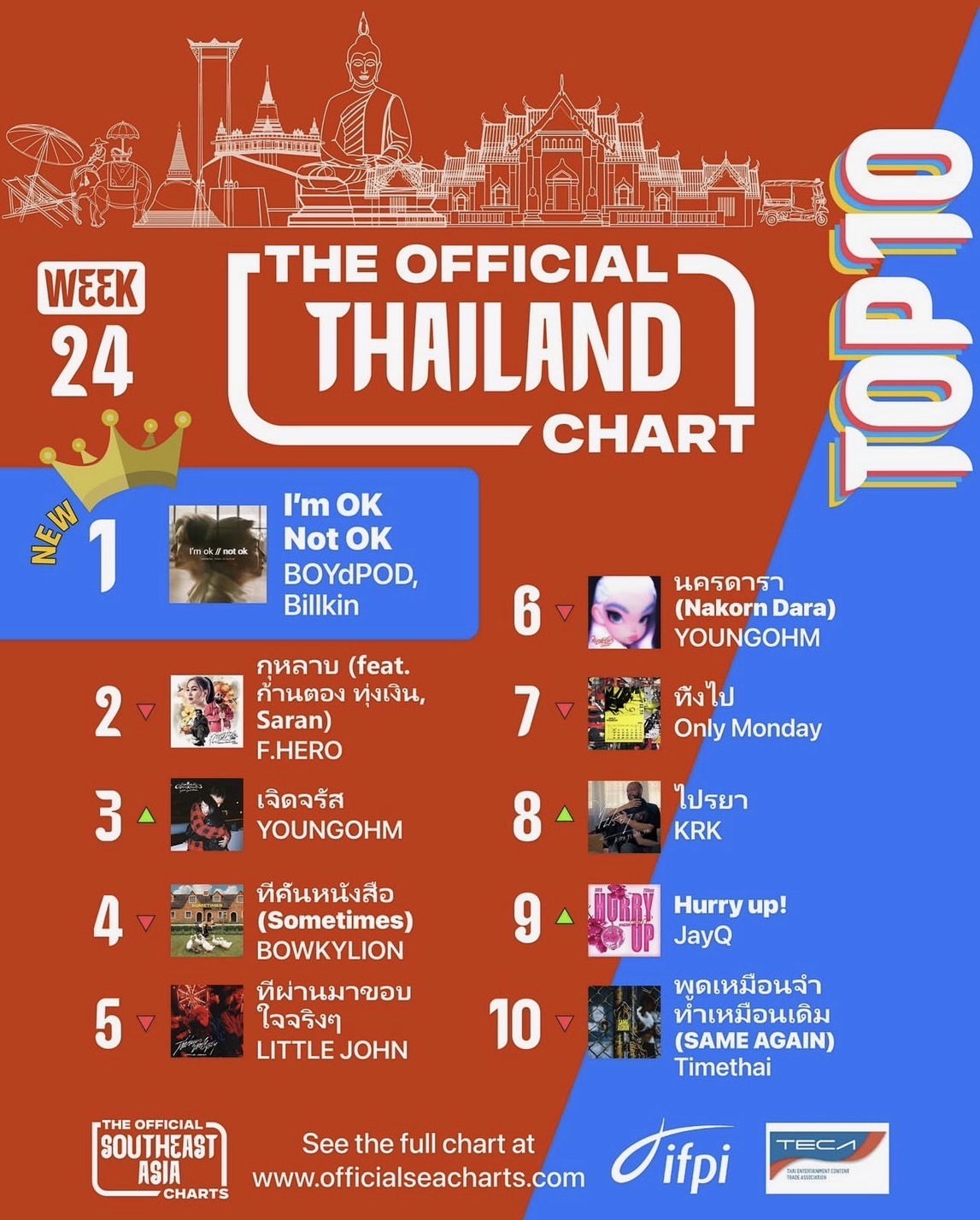 “The Official Thailand Chart” ชาร์ตเพลงที่รวบรวมทุกกระแสเพลงฮิตจากทุกแพลตฟอร์มสตรีมมิ่ง อัพเดททุกสัปดาห์ที่ https://www.instagram.com/teca_pnr และชาร์ตจากหลากหลายประเทศเอเชียตะวันออกเฉียงใต้ที่ https://www.instagram.com/officialseacharts โดยดำเนินการภายใต้การบริหารของ IFPI ร่วมกับ TECA โดยยึดหลักการและแนวทางปฏิบัติระดับโลกของ IFPI